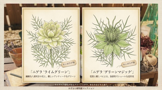 ところで、同じグリーン系のニゲラで 「グリーンマジック」 という品種もあるのをご存知ですか? どちらもグリーン好きにはたまらない品種なのですが、実は全然違うんです😊