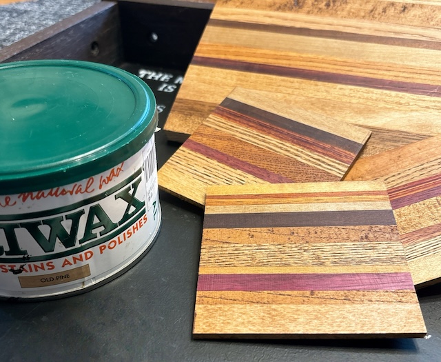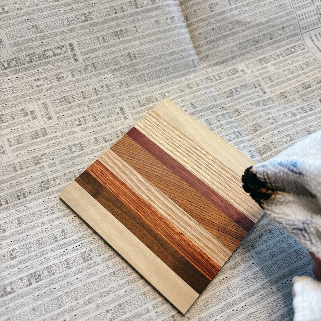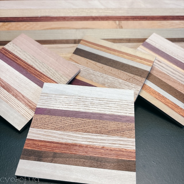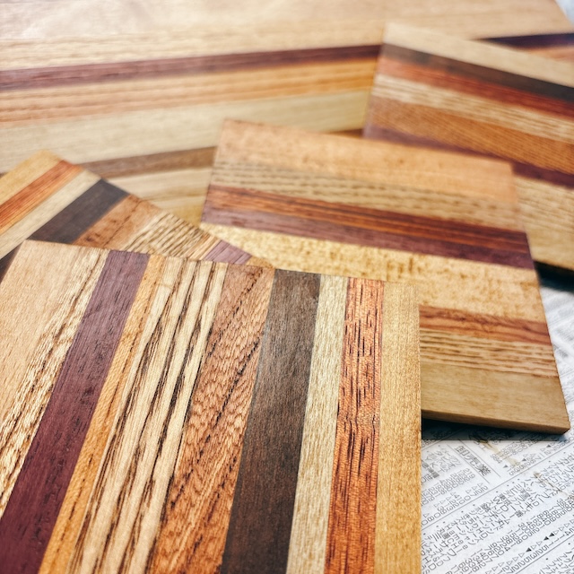 テーブルの上には、さまざまな種類の木を組み合わせた寄せ木の板たちがずらり。