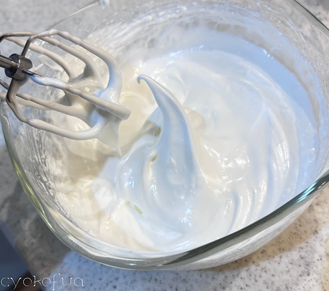 別のボウルで卵白を泡立て、砂糖を加えてしっかりしたメレンゲを作ります。