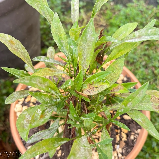 近づいてみると…ああ、やっぱり「うどんこ病」( ˘ω˘ )💧