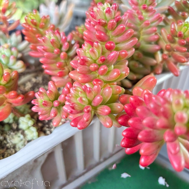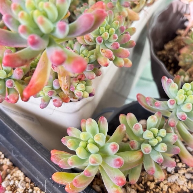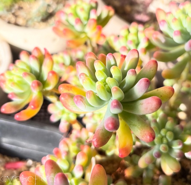 わが家の多肉植物たちも、そっと色づきはじめました。